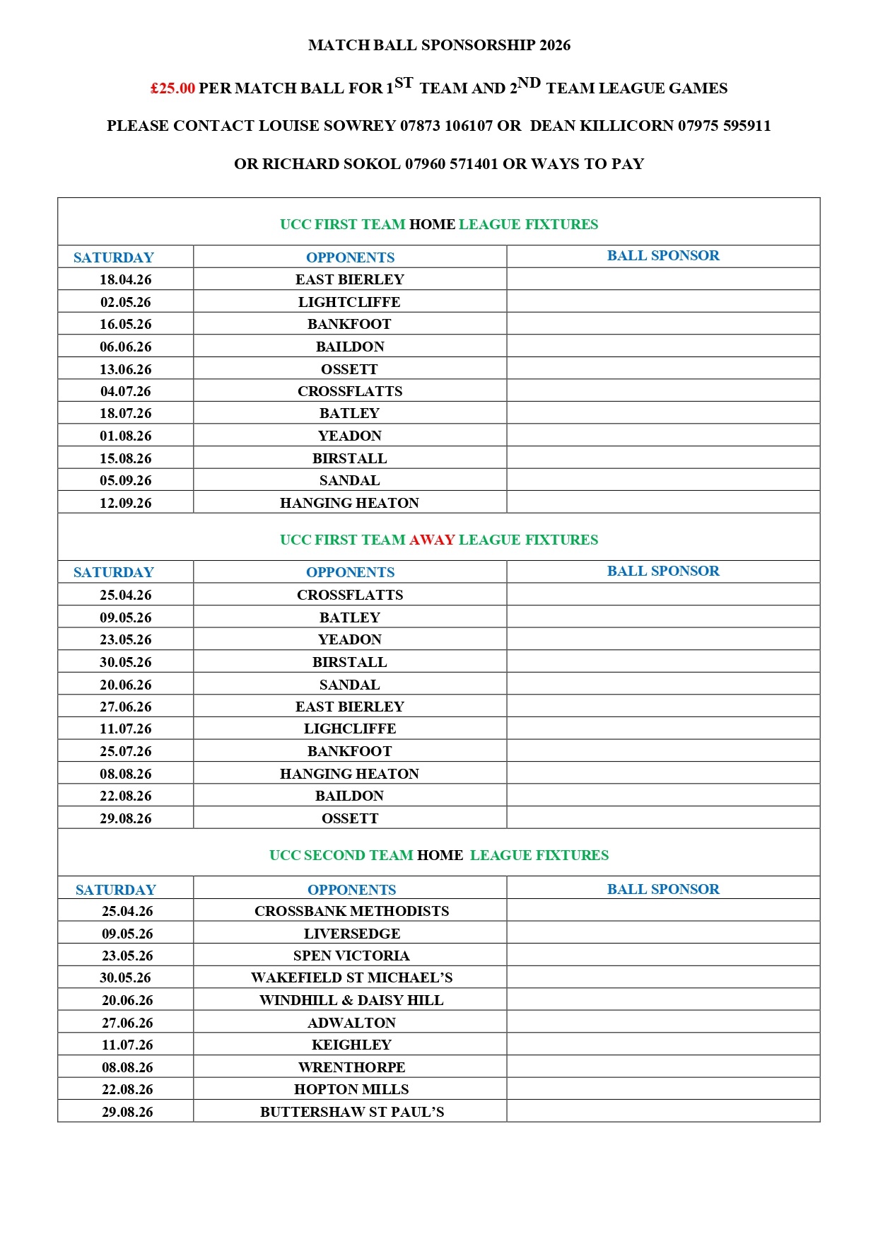 Ball sponsorship £25.00 a match for both first and second team league matches now on line plus who to contact on ways to pay.