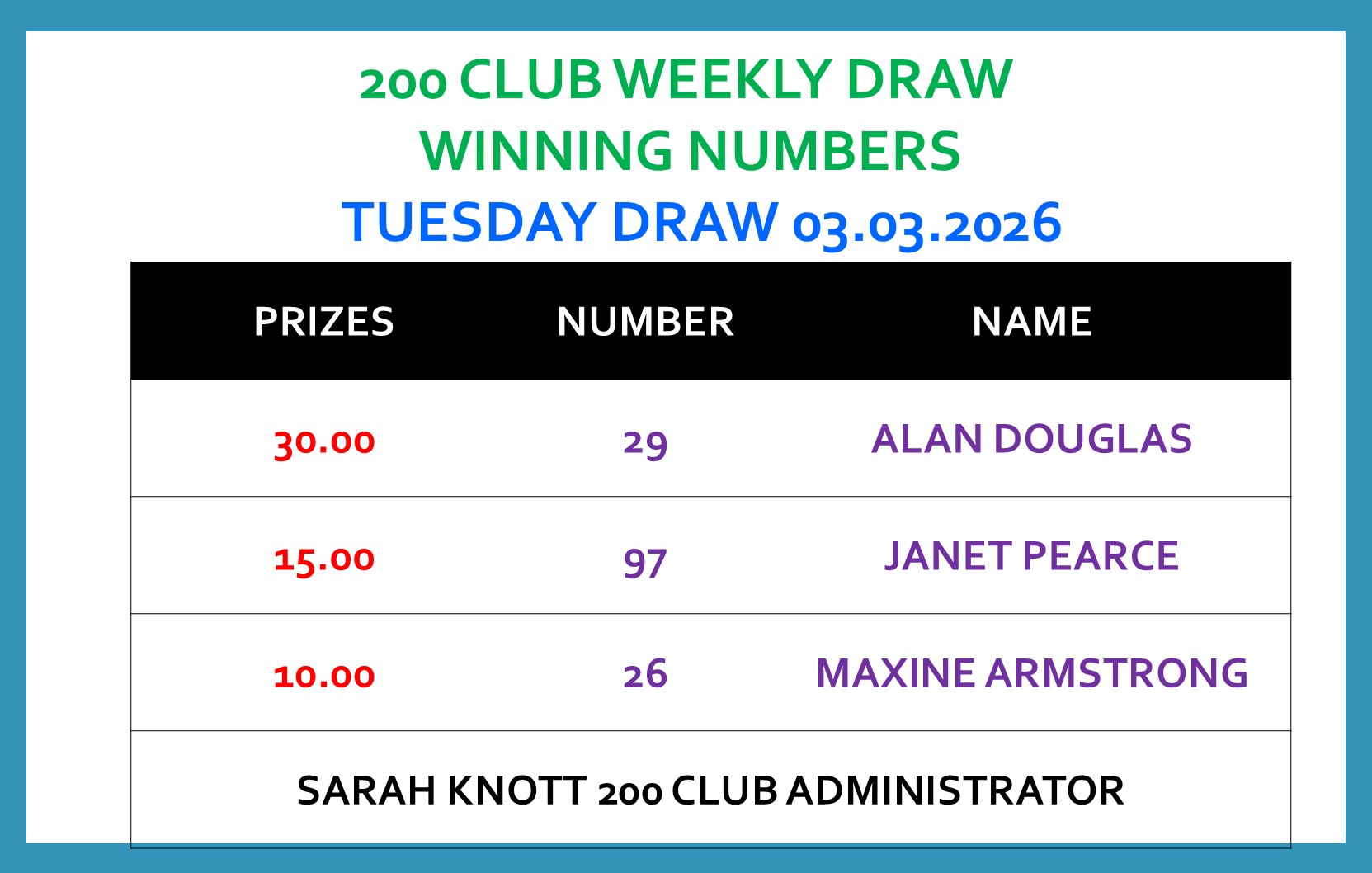 Winning number on line. Sarah Knott 200 Club Administrator.