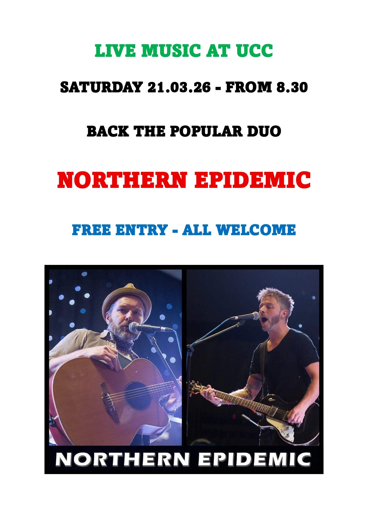 Featuring the very popular duo NORTHERN EPIDEMIC from 8.30pm. Free entry and all welcome.