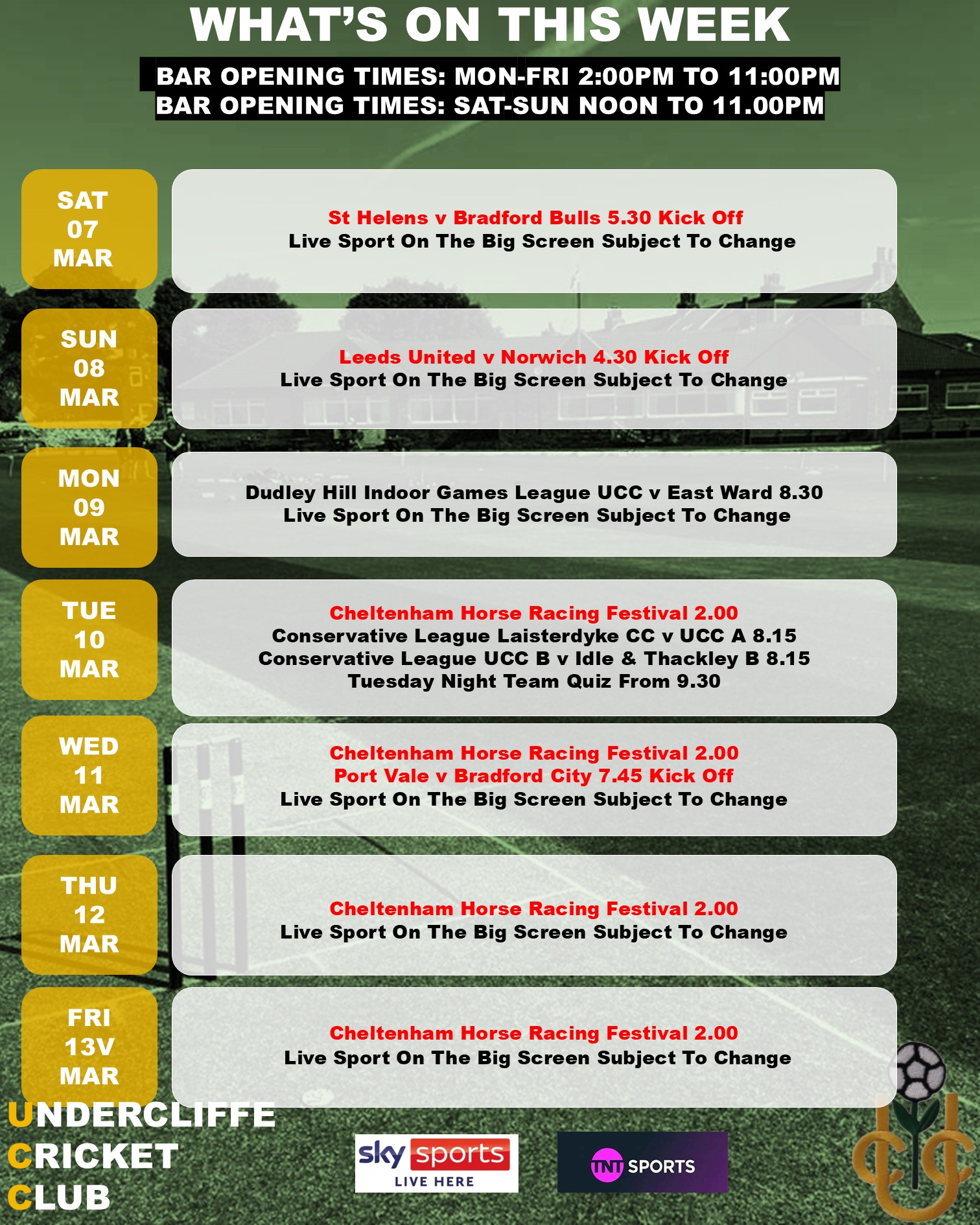 LIVE ON THE BIG SCREEN. Tuesday 10.03.26 To Friday 13.03.26, Club Open From 2.00 PM.